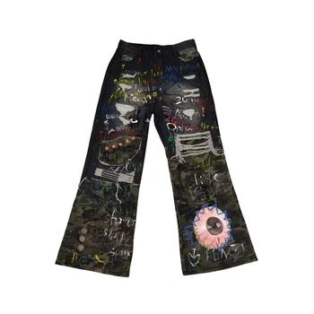 Personalizado de alta calidad de los hombres de lavado Vintage Flare Pantalones pintados a mano Casual Carpenter Denim Jeans Cintura media ODM High Street Style